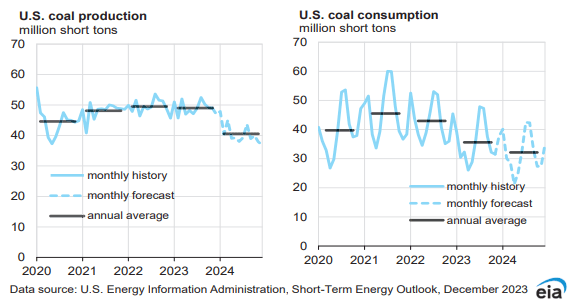 報告預計,2024年美國煤炭產量將再次下降17.27%至4.86億短噸,同樣高于前一月預期值4.65億短噸。