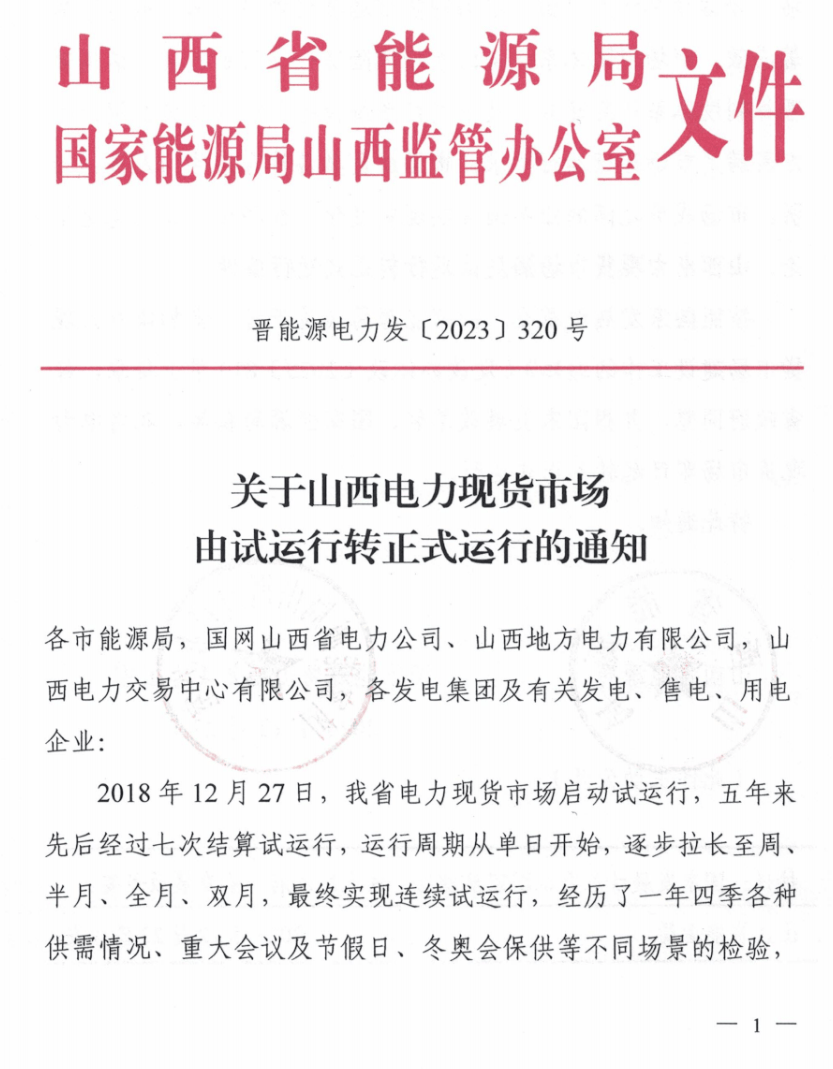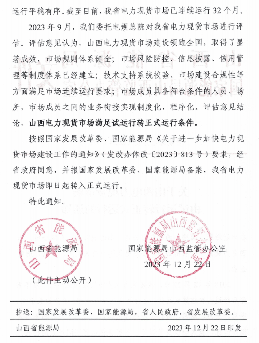近日,山西省能源局、山西能監辦發布《關于山西電力現貨市場由試運行轉正式運行的通知》(晉能源電力發[2023] 320號).通知稱,經報請山西省政府同意,并報國家發展改革委、國家能源局備案同意,山西電力現貨市場自2023年12月22日起轉入正式運行。標志著山西省電力現貨市場由試運行轉入正式運行,成為我國第一個正式運行的電力現貨市場。