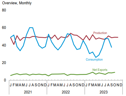 消費方面,報告顯示,今年9月份,美國煤炭總消費量為3761.2萬短噸,同比下降7.9%,環比下降20.4%。