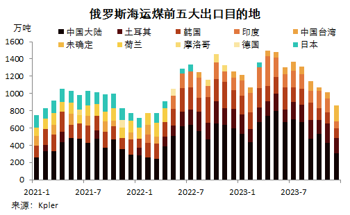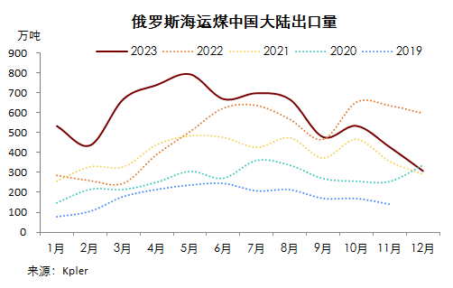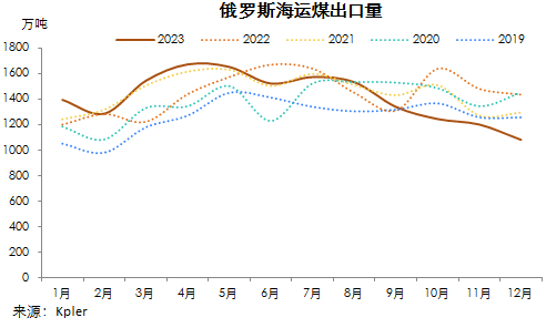 Kpler船舶追蹤數(shù)據(jù)顯示,2023年12月份,俄羅斯海運(yùn)煤出口量1082.13萬噸,環(huán)比降9.97%,連續(xù)第五月環(huán)比下降,同比降24.62%。