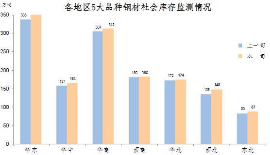 3月上旬,分地區來看,七大區域庫存環比繼續上升,具體情況為:華東庫存環比增加19萬噸,上升5.7%,為增量最大地區;西北增加13萬噸,上升9.6%,為升幅最大地區;華南增加8萬噸,上升2.6%;華中增加7萬噸,上升4.5%;東北增加4萬噸,上升4.8%;華北增加2萬噸,上升1.2%;西南增加2萬噸,上升1.1%。