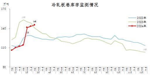 3月上旬,冷軋板卷庫存145萬噸,環比增加2萬噸,上升1.4%,庫存小幅上升;比年初增加42萬噸,上升40.8%;比上年同期增加5萬噸,上升3.6%。