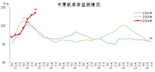 3月上旬,中厚板庫存141萬噸,環比增加4萬噸,上升2.9%,庫存連續上升;比年初增加47萬噸,上升50.0%;比上年同期增加26萬噸,上升22.6%。