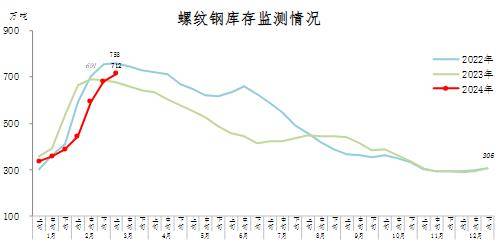 3月上旬,螺紋鋼庫存712萬噸,環比增加31萬噸,上升4.6%,庫存增速繼續回落;比年初增加407萬噸,上升133.4%;比上年同期增加33萬噸,上升4.9%。