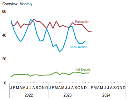 消費方面,報告顯示,2023年12月份,美國煤炭總消費量為3526.2萬短噸,同比下降22.32%,環比增長6.87%。