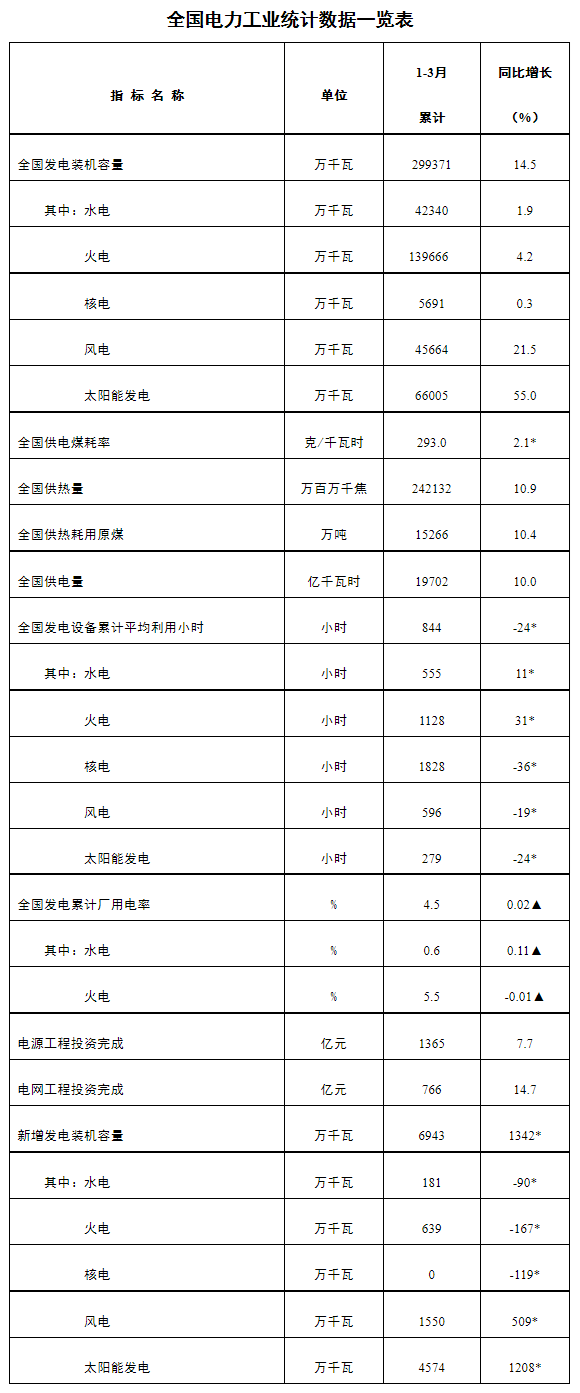 4月22日,國家能源局發布1-3月份全國電力工業統計數據。