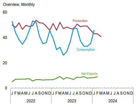 消費方面,報告顯示,2024年1月份,美國煤炭總消費量為4566.7萬短噸,同比增加16.9%,環(huán)比增長25.9%。
