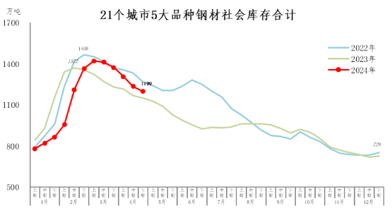 4月下旬,21個城市5大品種鋼材社會庫存1199萬噸,環(huán)比減少38萬噸,下降3.1%,庫存連續(xù)下降,降幅收窄;比3月下旬減少175萬噸,下降12.7%;比年初增加470萬噸,上升64.5%;比上年同期增加48萬噸,上升4.2%。