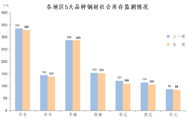 4月下旬,分地區(qū)來看,七大區(qū)域庫存環(huán)比均有不同程度下降,具體情況為:華北庫存環(huán)比減少12萬噸,下降9.9%,為減量和降幅最大地區(qū);華南減少1萬噸,下降0.3%;西南減少2萬噸,下降1.3%;西北減少9萬噸,下降7.9%;華中減少6萬噸,下降4.2%;華東減少6萬噸,下降1.8%;東北減少2萬噸,下降2.3%。