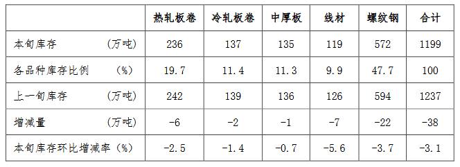 4月下旬,5大品種鋼材社會庫存環(huán)比全部下降,其中螺紋鋼和線材分別為減量和降幅最大品種,具體見下表。