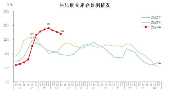 4月下旬,熱軋板卷庫存236萬噸,環(huán)比減少6萬噸,下降2.5%;比3月下旬減少16萬噸,下降6.3%;比年初增加92萬噸,上升63.9%;比上年同期增加37萬噸,上升18.6%。