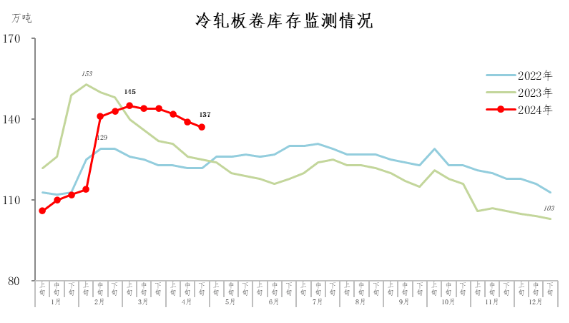 4月下旬,冷軋板卷庫存137萬噸,環(huán)比減少2萬噸,下降1.4%,庫存連續(xù)小幅下降;比3月下旬減少7萬噸,下降4.9%;比年初增加34萬噸,上升33.0%;比上年同期增加12萬噸,上升9.6%。