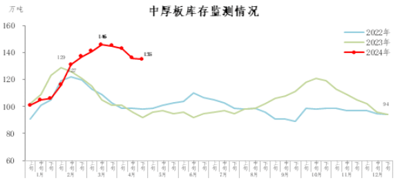 4月下旬,中厚板庫存135萬噸,環(huán)比減少1萬噸,下降40.7%,庫存降幅收窄;比3月下旬減少10萬噸,下降6.9%;比年初增加41萬噸,上升43.6%;比上年同期增加43萬噸,上升46.7%。