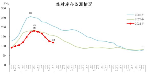 4月下旬,線材庫存119萬噸,環(huán)比減少7萬噸,下降5.6%,庫存連續(xù)下降,降幅有所收窄;比3月下旬減少48萬噸,下降28.7%;比年初增加36萬噸,上升43.4%;比上年同期減少38萬噸,下降24.2%。