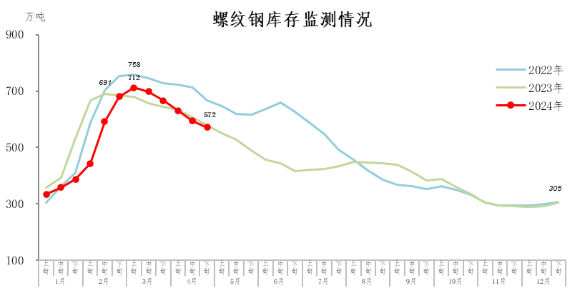 4月下旬,螺紋鋼庫存572萬噸,環(huán)比減少22萬噸,下降3.7%,庫存繼續(xù)下降;比3月下旬減少94萬噸,下降14.1%;比年初增加267萬噸,上升87.5%;比上年同期減少6萬噸,下降1.0%。