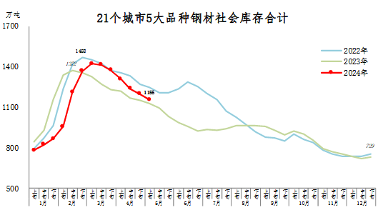 5月上旬,21個城市5大品種鋼材社會庫存1155萬噸,環比減少44萬噸,下降3.7%,庫存繼續下降;比年初增加426萬噸,上升58.4%;比上年同期增加25萬噸,上升2.2%。