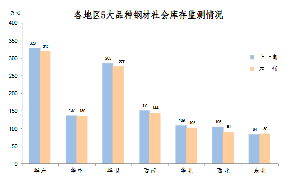 5月上旬,分地區來看,七大區域除東北庫存環比略有上升外,其他地區均有不同程度下降,具體情況為:西北庫存環比減少14萬噸,下降13.3%,為減量和降幅最大地區;華東減少9萬噸,下降2.7%;華南減少8萬噸,下降2.8%;華北減少7萬噸,下降6.4%;西南減少7萬噸,下降4.6%;華中減少1萬噸,下降0.7%;東北增加2萬噸,上升2.4%。