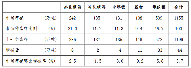 5月上旬,5大品種鋼材社會庫存除熱軋板卷環比上升外,其他品種全部下降,其中螺紋鋼為減量最大品種,線材為降幅最大品種,具體見下表。