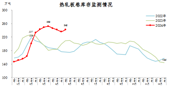 5月上旬,熱軋板卷庫存242萬噸,環比增加6萬噸,上升2.5%,庫存由降轉升;比年初增加98萬噸,上升68.1%;比上年同期增加33萬噸,上升15.8%。