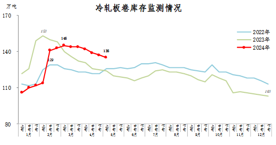 5月上旬,冷軋板卷庫存135萬噸,環比減少2萬噸,下降1.5%,庫存連續小幅下降;比年初增加32萬噸,上升31.1%;比上年同期增加11萬噸,上升8.9%。