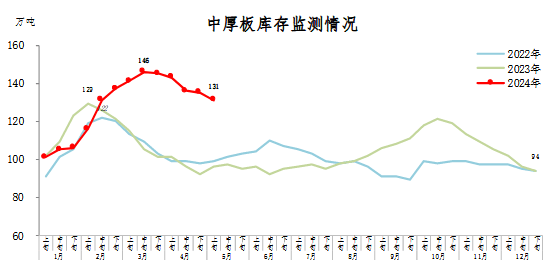 5月上旬,中厚板庫存131萬噸,環比減少4萬噸,下降3.0%;比年初增加37萬噸,上升39.4%;比上年同期增加35萬噸,上升36.5%。