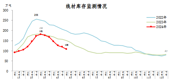 5月上旬,線材庫存108萬噸,環比減少11萬噸,下降9.2%,庫存降幅擴大;比年初增加25萬噸,上升30.1%;比上年同期減少43萬噸,下降28.5%。