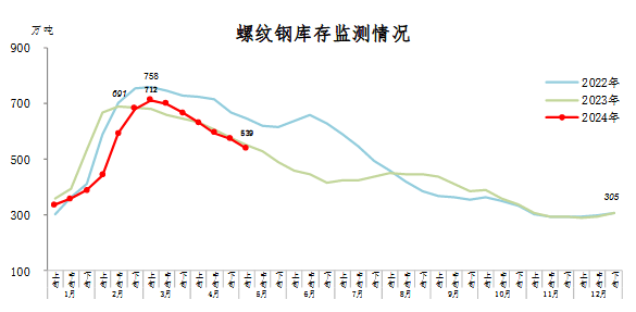 5月上旬,螺紋鋼庫存539萬噸,環比減少33萬噸,下降5.8%,庫存持續下降;比年初增加234萬噸,上升76.7%;比上年同期減少11萬噸,下降2.0%。