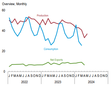 消費方面,報告顯示,2024年3月份,美國煤炭總消費量為2562.2萬短噸,同比下降20.56%,環比下降12.5%。