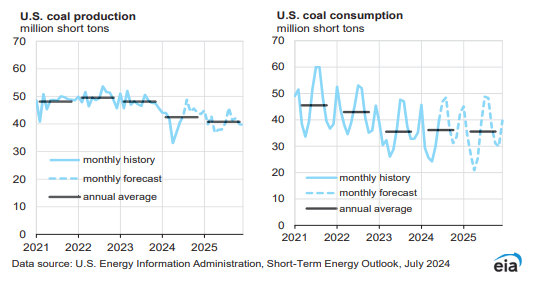 產量方面,《短期能源展望》報告預計,2024年,美國煤炭產量為5.097億短噸,高于前一月預期值5.06億短噸,但較2023年的5.775億短噸下降11.74%。2025年,美國煤炭產量預計為4.895億短噸,同比下降3.96%。