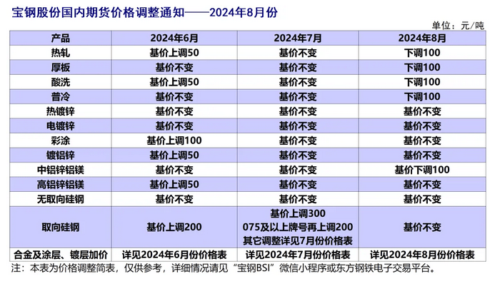 經研究決定,寶鋼股份板材內銷價格2024年8月份在2024年7月份基礎上調整公告如下(以下除特殊注明外,均為不含稅):