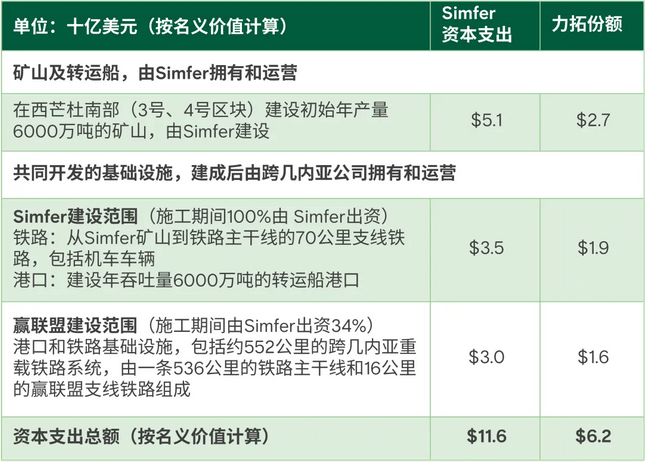 Simfer對(duì)西芒杜項(xiàng)目整體的資金需求約為116億美元,其中力拓集團(tuán)所承擔(dān)份額約為62億美元,具體如下: