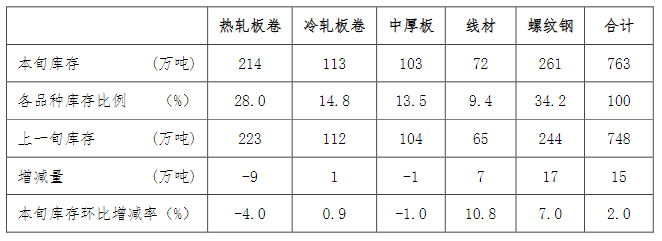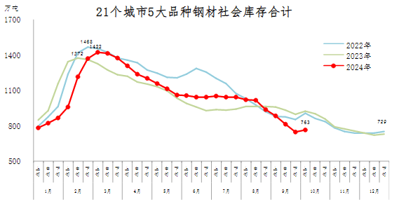 10月上旬,21個城市5大品種鋼材社會庫存763萬噸,環比增加15萬噸,上升2.0%,庫存連續8旬下降后首次上升;比年初增加34萬噸,上升4.7%;比上年同期減少161萬噸,下降17.4%。