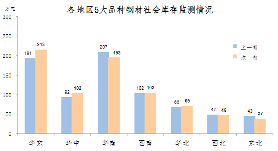 10月上旬,分地區來看,七大區域鋼材庫存環比各有升降,具體情況為:華東庫存環比增加22萬噸,上升11.5%,為增量和升幅最大地區;華中增加10萬噸,上升10.9%;華北增加3萬噸,上升4.5%;西南增加1萬噸,上升1.0%;華南庫存環比減少14萬噸,下降6.8%,為減量最大地區;東北減少6萬噸,下降14.0%,為降幅最大地區;西北減少1萬噸,下降2.1%。