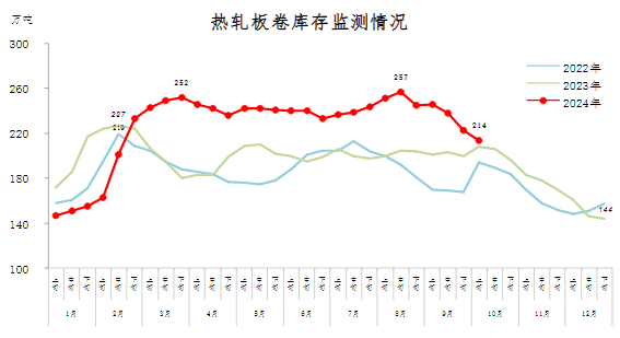 10月上旬,熱軋板卷庫存214萬噸,環比減少9萬噸,下降4.0%,庫存降幅收窄;比年初增加70萬噸,上升48.6%;比上年同期增加6萬噸,上升2.9%。