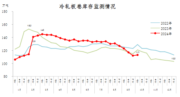 10月上旬,冷軋板卷庫存113萬噸,環比增加1萬噸,上升0.9%,庫存由下降轉為小幅上升;比年初增加10萬噸,上升9.7%;比上年同期減少8萬噸,下降6.6%。