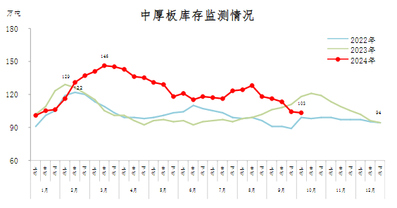 10月上旬,中厚板庫存103萬噸,環比減少1萬噸,下降1.0%,庫存降幅收窄;比年初增加9萬噸,上升9.6%;比上年同期減少15萬噸,下降12.7%。