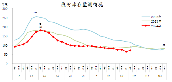 10月上旬,線材庫存72萬噸,環比增加7萬噸,上升10.8%庫存回升幅度較大;比年初減少11萬噸,下降13.3%;比上年同期減少17萬噸,下降19.1%。