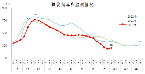10月上旬,螺紋鋼庫存261萬噸,環比增加17萬噸,上升7.0%,庫存連續8旬下降后首次上升;比年初減少44萬噸,下降14.4%;比上年同期減少127萬噸,下降32.7%。