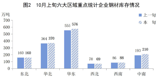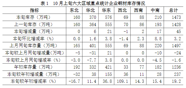 10月上旬,除東北地區重點企業鋼材庫存較上一旬基本持平,西北地區略有下降外,其它地區均有不同程度增長(見圖2、表1),具體情況為: