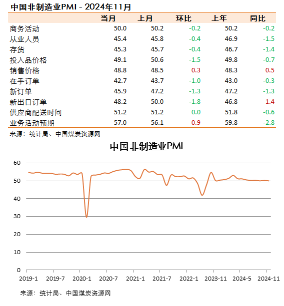 11月份,非制造業商務活動指數為50.0%,比上月下降0.2個百分點,位于臨界點。