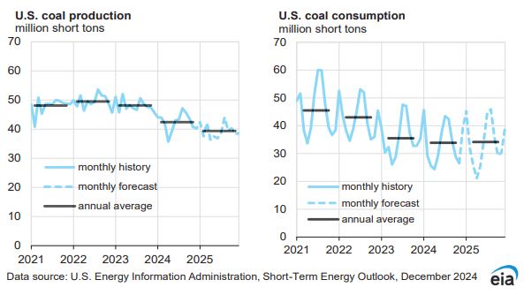 2025年,美國煤炭消費量預計為4.094億短噸,略高于前一月預計的4.085億短噸,同比微增0.84%。其中,電力行業煤炭消費量預計3.725億短噸,零售及其他行業煤炭消費量2170萬短噸。
