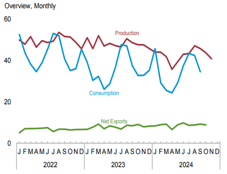 消費方面,報告顯示,2024年9月份,美國煤炭總消費量為3453.5萬短噸,同比下降7.52%,環比下降18.57%。