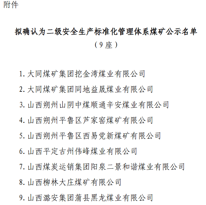 擬確認(rèn)二級安全生產(chǎn)標(biāo)準(zhǔn)化管理體系煤礦的公示