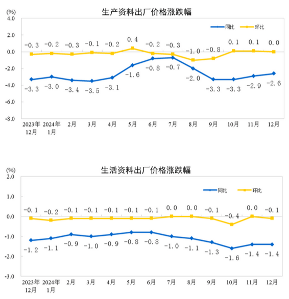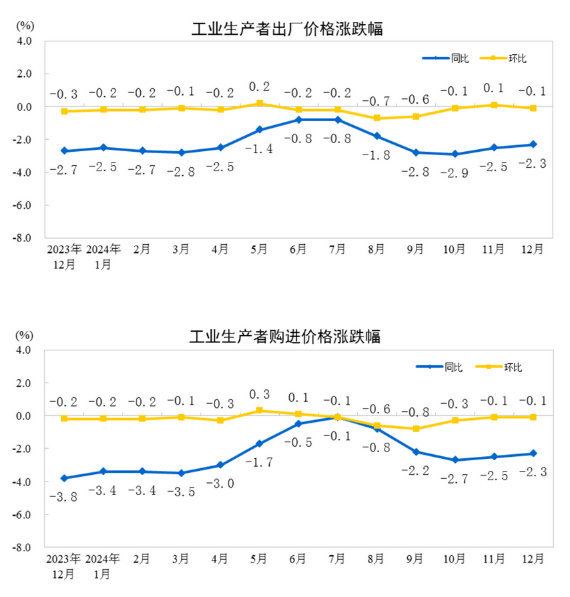 2024年12月份,全國工業(yè)生產(chǎn)者出廠價格和購進價格同比均下降2.3%,降幅比上月均收窄0.2個百分點;環(huán)比均下降0.1%。2024年全年,工業(yè)生產(chǎn)者出廠價格和購進價格均下降2.2%,降幅比上年分別收窄0.8、1.4個百分點。