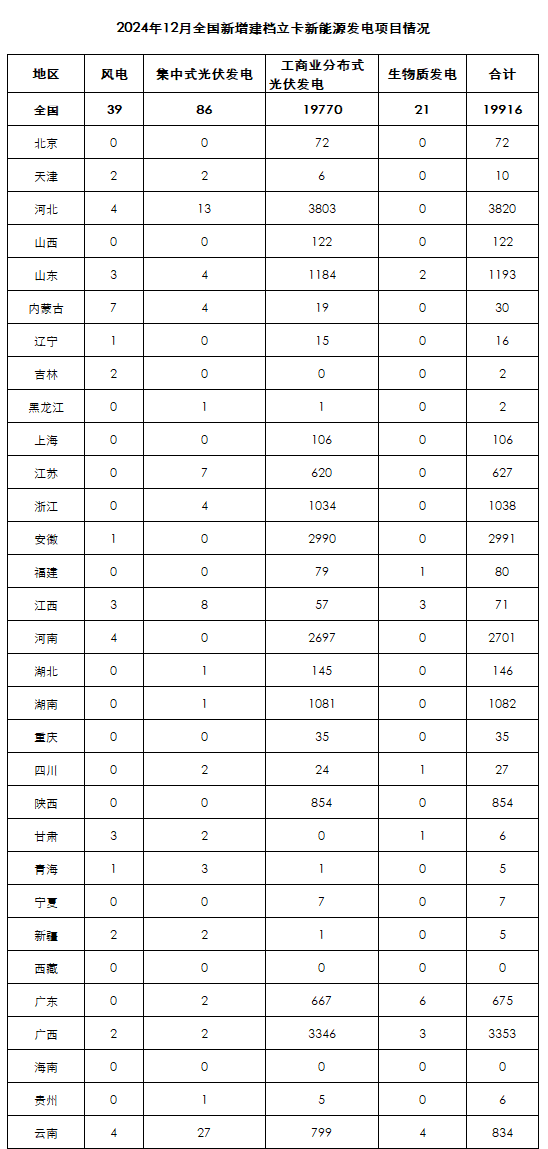 2024年12月,全國新增建檔立卡新能源發電(不含自然人戶用光伏)項目共19916個,其中風電項目39個,光伏發電項目19856個(集中式光伏發電項目86個,工商業分布式光伏發電項目19770個),生物質發電項目21個。風電、集中式光伏發電、生物質發電項目清單見附件,工商業分布式光伏發電項目清單詳見國家可再生能源發電項目信息管理平臺網站。